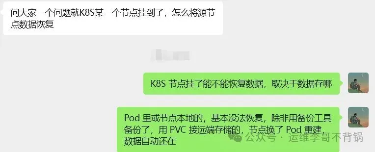 K8S 节点挂了能不能恢复数据,取决于数据存在哪。 Pod 里或节点本地的,基本没法恢复; 用 PVC 接远端存储的,节点换了 Pod 重建,数据自然还在。 交流群中一个用户问了一个很有价值的问题: