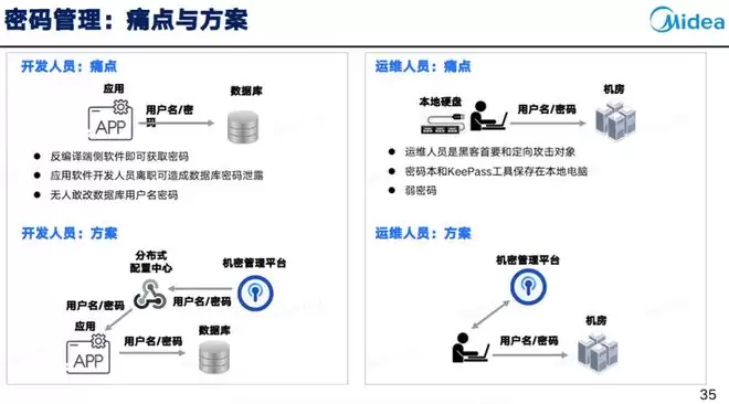 密码是信息安全的基石,但很多企业的密码管理存在严重漏洞:应用系统访问数据库的密码多直接写死在代码中,一套密码往往被多个业务系统所使用,导致密码难以定期轮换,存在很大的脱库风险;此外,运维人员习惯用 “密码本” 记录各类密码,而这类密码本非常容易通过钓鱼攻击被窃取。