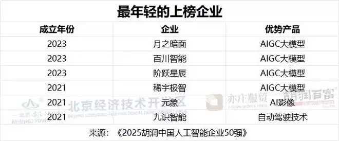 胡润称,AI企业都普遍年轻,上榜企业平均成立于12年前。成立于2024年以后的上榜企业有6家,分别是月之暗面、百川智能、阶跃星辰、稀宇极智、元象、九识智能。其中,前四者均为大模型企业。