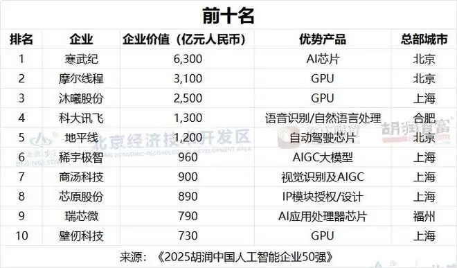 1 月 19 日消息,胡润研究院今日发布《2025 胡润中国人工智能企业 50 强》:AI 芯片企业寒武纪以 6300 亿元的价值位居榜首,比去年增长 165%;国产 GPU 第一股摩尔线程排名第