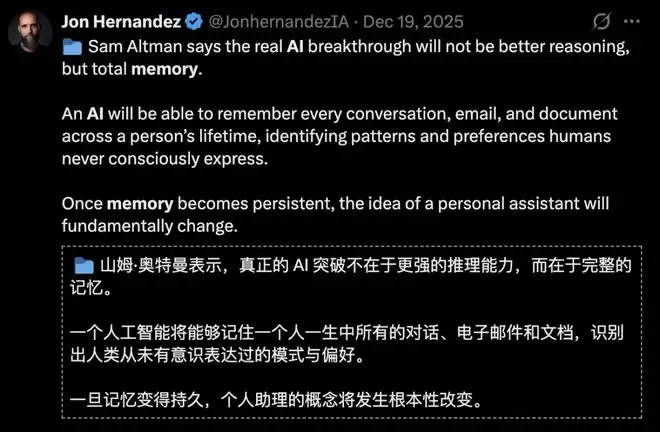 而奥特曼对持久记忆寄予厚望,甚至表示:「AI真正的突破不是更好的推理能力,而是完整的以及能力,一旦记忆可以持久,(智能)AI助理的概念彻底改变。」