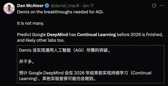 谷歌DeepMind的Demis Hassabis则判断,要实现真正的AGI,需要的突破并不多。而首个突破持续学习,预计将在2026年底实现。