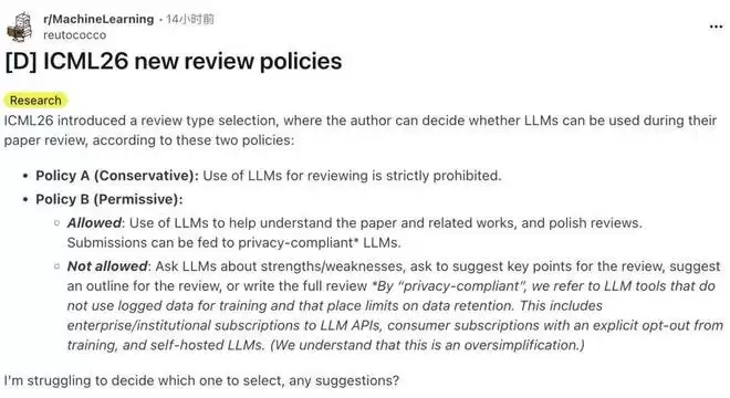 我们简单概括一下,ICML 2026 引入了评审类型选择机制,论文作者可以自行决定是否允许在评审过程中使用大语言模型。