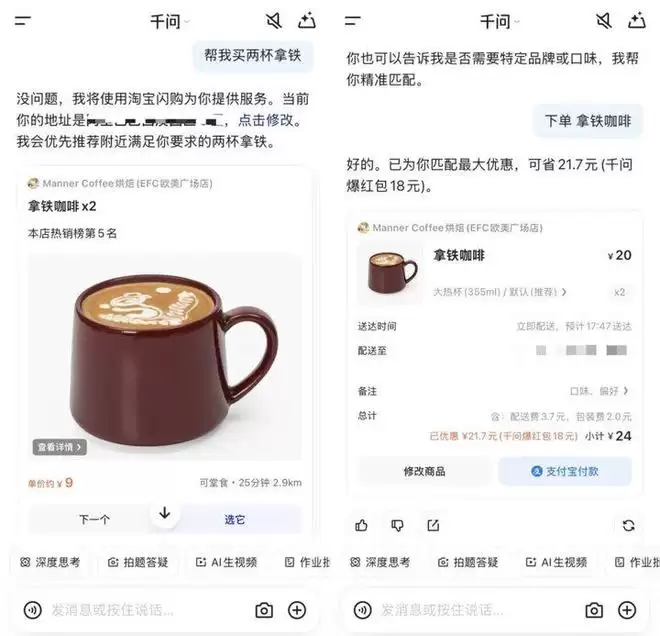 在深度上,同属阿里生态的成员,千问对淘宝、支付宝、淘宝闪购、高德、飞猪等服务的打通比其他AI助手对第三方App的打通更为顺畅、完善。用千问点奶茶时,用户可以轻松通过千问完成选店铺、选饮品、改地址等操作。甚至可以顺畅到你提出要求后,只需要点一下支付宝链接进行付款。