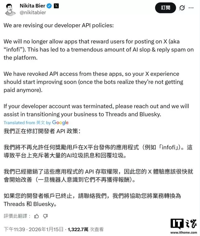 海外科技网站IT之家本周五证实,社交平台X(原Twitter)的产品负责人尼基塔·比尔近日公开宣布,将对开发者接口使用政策进行调整。