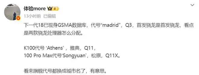 根据多方外媒及数据库信息,REDMI K100系列的身份信息已基本明确,标准版K100内部代号为“Athens”(雅典),型号Q11;而定位更高的K100 Pro Max代号则为“Songyuan”(松原),型号Q11X。