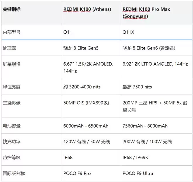 以下是基于目前爆料汇总的REDMI K100系列核心参数对比表: