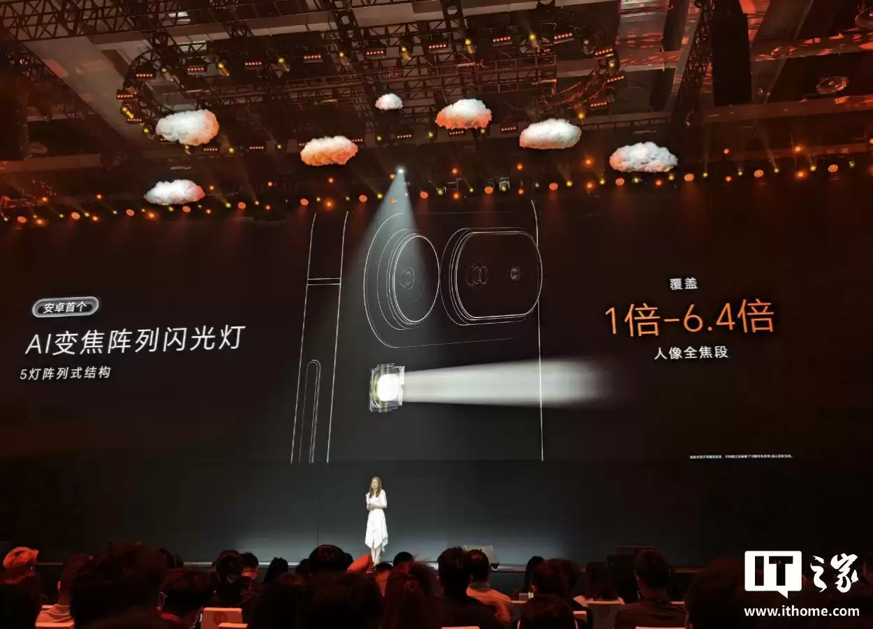 此外,新机还首发了安卓平台首个AI变焦阵列闪光灯,采用五灯矩阵式结构,能够覆盖从1倍到6.4倍变焦的全焦段人像拍摄。同时,它也行业首发了“CCD爆闪人像”模式,并提供目前行业内最全面的AI闪光灯趣味玩法。