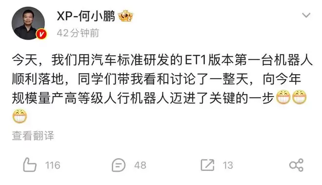 1月19日,小鹏汽车(XPEV US)董事长何小鹏在微博发文称,今天,我们用汽车标准研发的ET1版本第一台机器人顺利落地,向今年规模量产高等级人行机器人迈进了关键的一步。