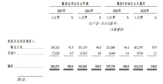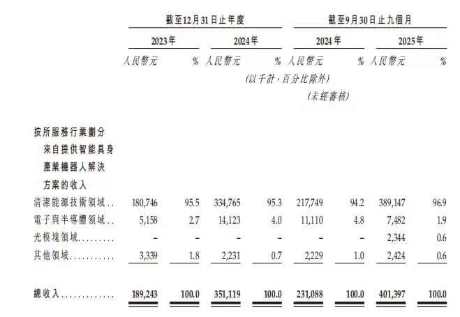 来自清洁能源技术领域的营收占据了其智能具身产业机器人解决方案收入的绝大部分。2023年至2025年前九个月,该部分收入分别为1.81亿元、3.35亿元及3.89亿元,占比分别为95.5%、95.3%及96.9%。