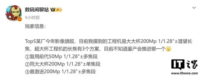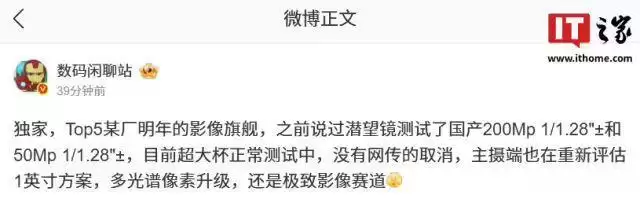 按照微博博主的说法,Top5 某厂今年影像旗舰,目前摸到的工程机是搭载 2 亿像素 1/1.28 英寸潜望长焦。
