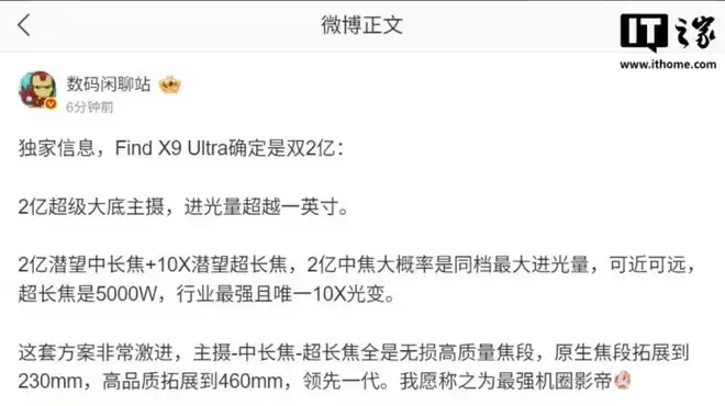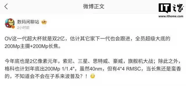 就在今天(1 月 19 日),微博博主发文透露,OV 这一代的超大杯机型将搭载双 2 亿镜头,其他家预计会在下一代跟进,形成“全员超大底 2 亿像素主摄 +2 亿长焦”格局。