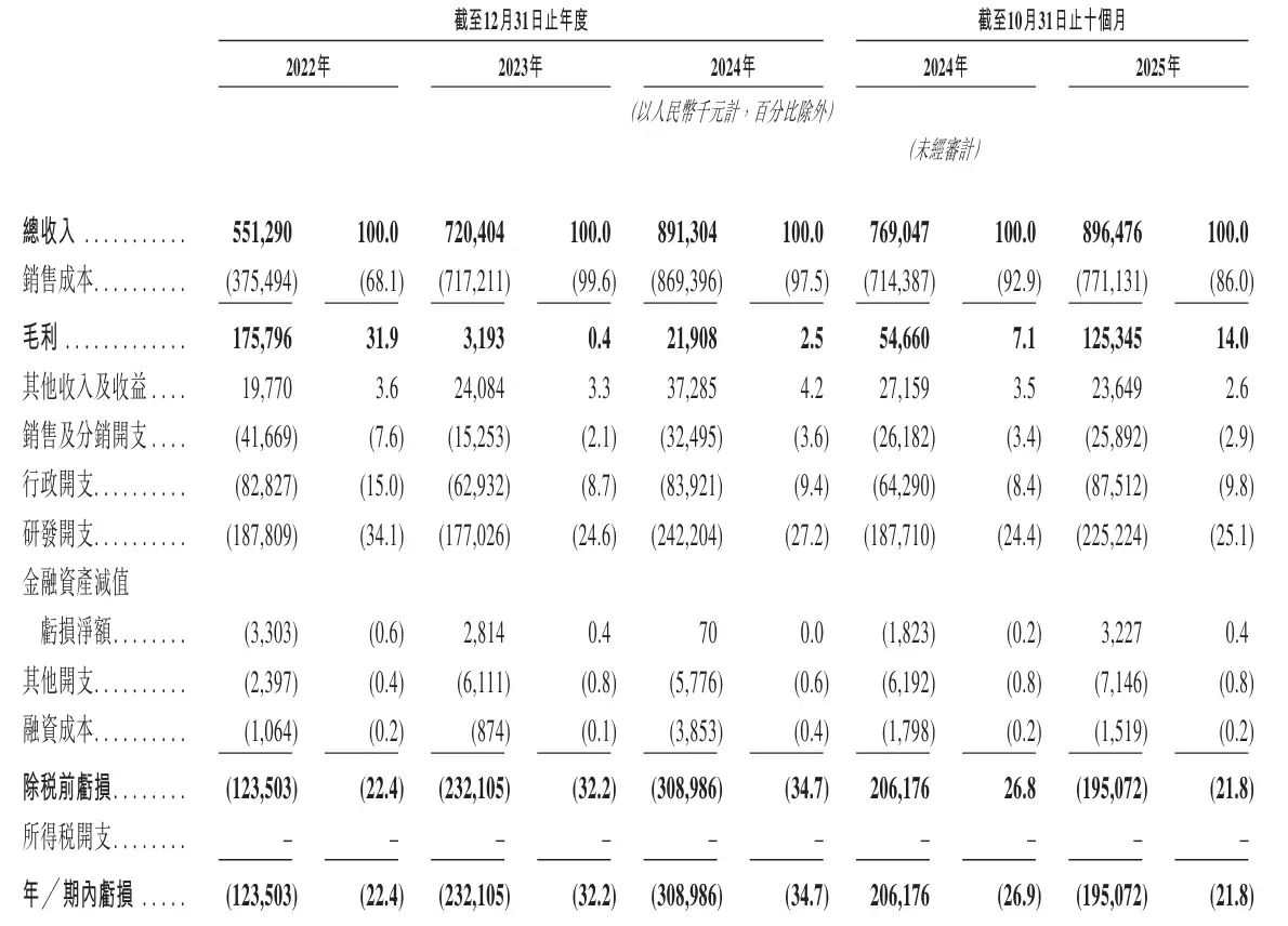 2022年、2023年及2024年,云英谷经调整净利分别为68万元、-2.17亿元和-2.24亿元;经调整净利率分别为0.1%、-30.2%和-25.1%。2025年前十个月,公司经调整净亏损为1亿元。