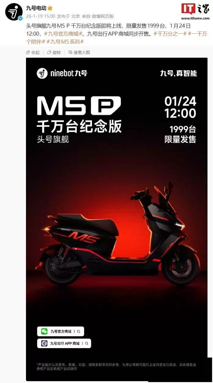 九号头号旗舰M5+P千万台纪念版1月24日限量发售:1999台
