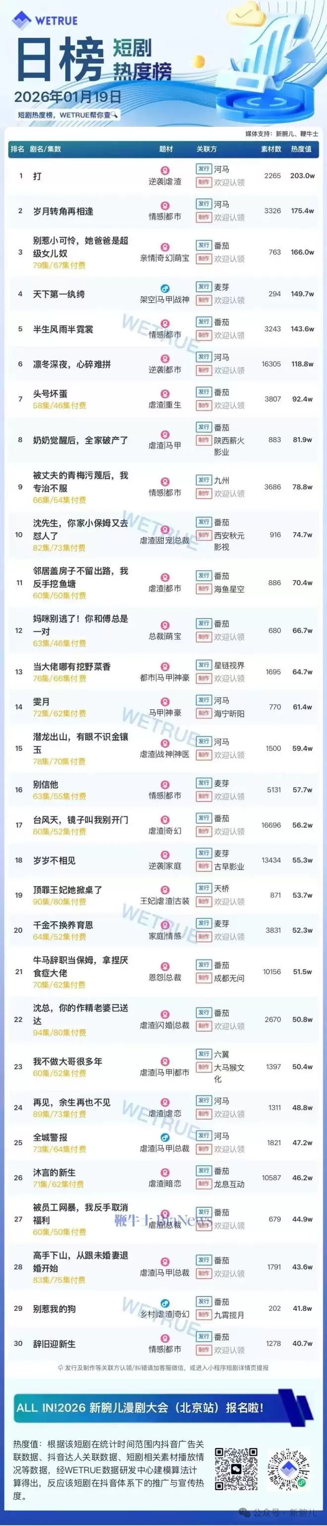 19日短剧热度榜:《打》登顶,大盘总热度4253万