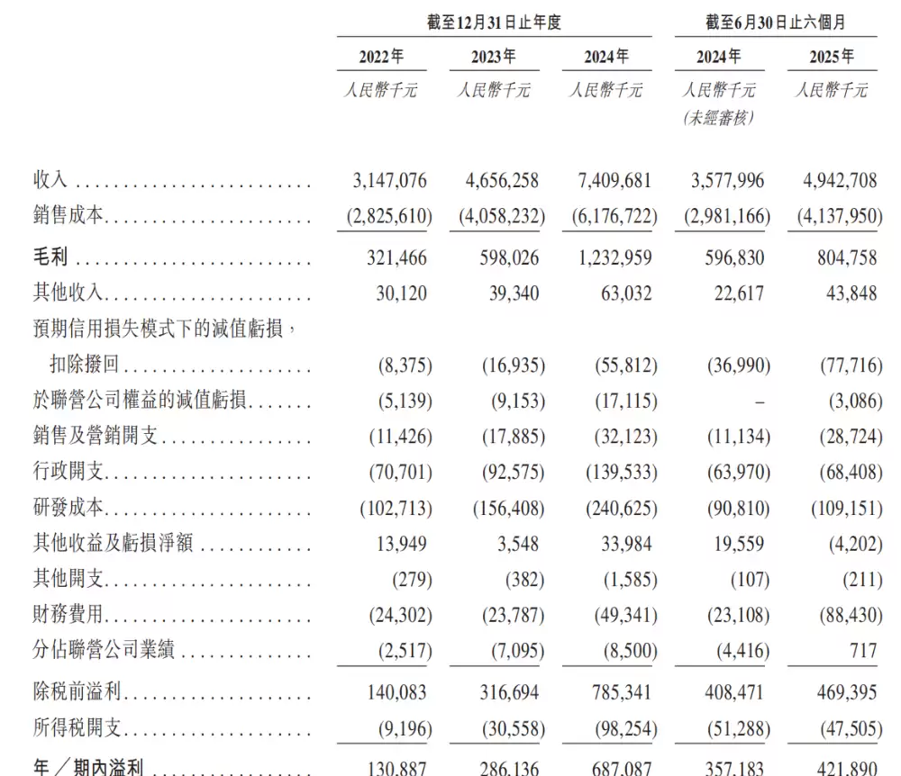 在2024财年、2024财年、2024财年及2025年前六个月,公司的毛利润分别达到了321.5百万元、598.0百万元、1233.0百万元及804.8百万元人民币,同期毛利率分别为10.2%、12.8%、16.6%与16.3%。净利润方面,分别为130.9百万元、286.1百万元、687.1百万元及421.9百万元人民币。
