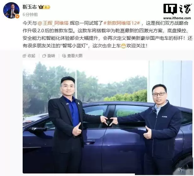 华为智能汽车解决方案BU CEO靳玉志与阿维塔科技董事长王辉共同试驾了全新阿维塔12,这款车型是双方战略合作进入2.0阶段后的首款力作。试驾过程中,靳玉志透露,新款阿维塔12将搭载华为乾崑最新的四激光雷达方案,在底盘操控、安全性能以及智能化体验上都将迎来显著提升,有望重新定义国产电动汽车在智美新豪华领域的标杆地位。备受关注的“智驾小蓝灯”功能也将首次应用于这款车型。