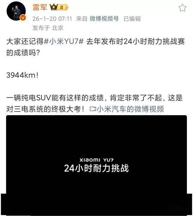 小米YU7纯电续航3944公里引雷军点赞,三电技术突破创纪录
