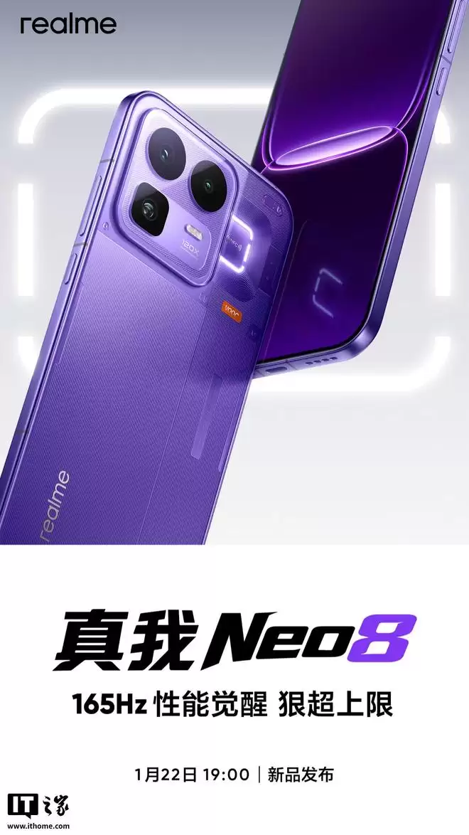结合IT之家此前报道,realme真我Neo 8手机将于1月22日晚19:00正式发布,其主要配置信息如下: