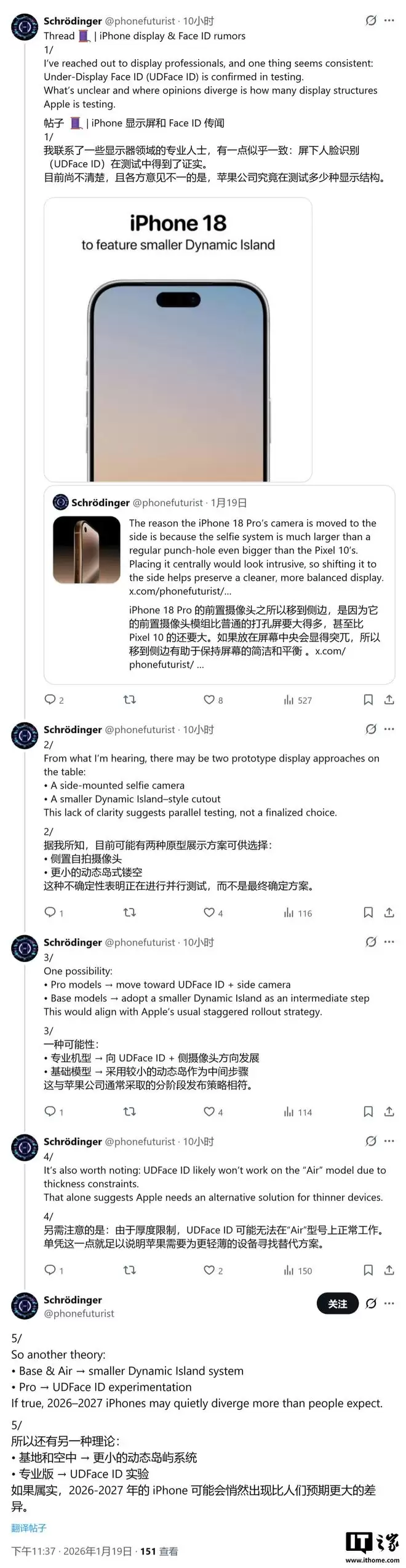 关于iPhone 18 Pro及Pro Max的设计,多方消息称苹果计划在高端Pro系列上实施一项显著改动:将前置摄像头和灵动岛从目前顶部的居中位置移至屏幕左上角,并配合屏下TrueDepth模组,以进一步提升屏占比。