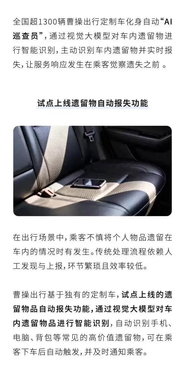近日,曹操出行在全国范围内试点上线「落东西」自动报失功能,利用视觉大模型识别车内高价值遗留物,并在乘客尚未察觉遗失前主动触发提醒,进一步完善 Robotaxi 时代的智能化服务体系。