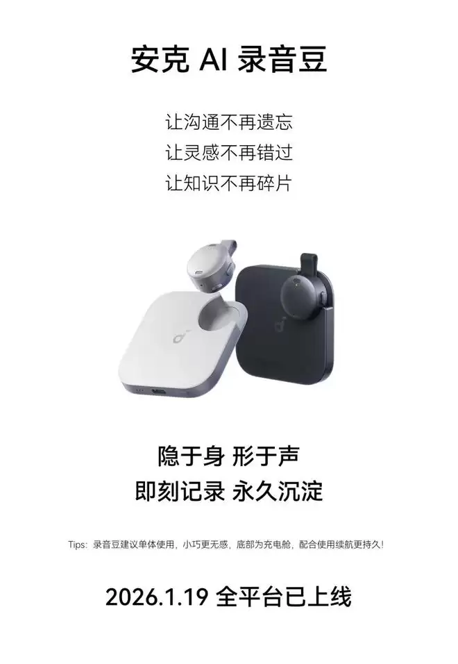 昨天,安克创新与飞书联合推出全新 AI 录音硬件「AI 录音豆」,主打极轻量化与深度软件协同,定位为可随身佩戴的「第二大脑」。