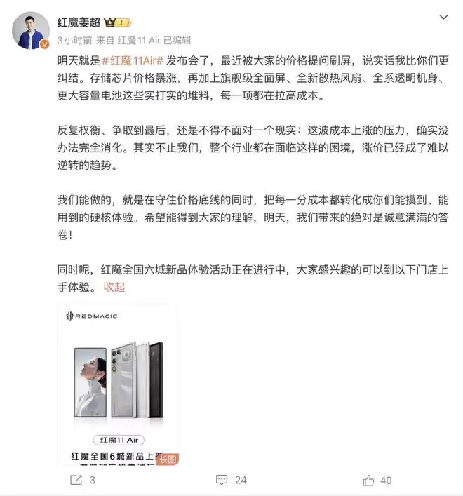 昨天,红魔游戏手机产品总经理姜超在微博发文,回应外界对红魔 11 Air 新品定价的关注。