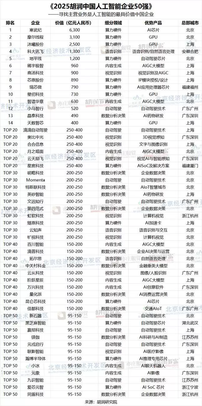 《2025 胡润中国人工智能 50 强》发布,寒武纪登顶 6300 亿元