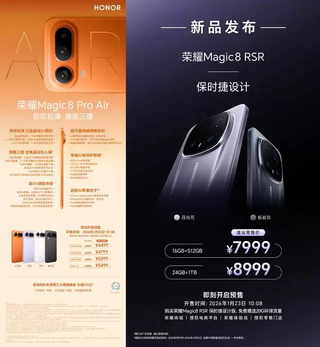 售价方面,荣耀 Magic8 RSR 16GB + 512GB 版本起售价 7999 元,24GB + 1TB 版本 8999 元,两款新机将同步于 1 月 23 日 10:08 正式开售。