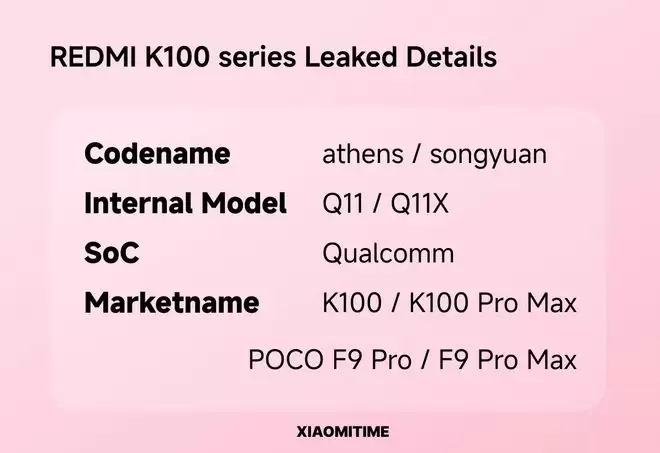 其中,标准版的REDMI K100开发代号为“Athens(雅典)”,内部型号为Q11;而定位更高的旗舰机型REDMI K100 Pro Max的开发代号则为“Songyuan(松原)”,内部型号为Q11X。