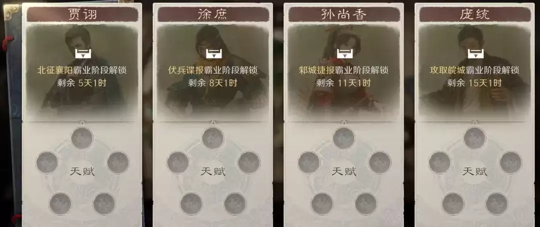 该系统面向特定武将开放天赋学习功能,初始可选定4名角色。武将解锁数量与玩家达成的霸业进度挂钩,逐步开放。已学习天赋的武将支持重置,冷却时间为2天;亦可消耗100黄金立即重置。天赋学习需使用武略点,每位角色初始拥有8点,后续需通过赛季进程逐步累积。所习得的战法为角色专属,仅限该武将使用;学习期间该角色不可上阵。天赋衍生的战法分为三类:影本、镜本、专精战法,均不可与原战法共存,且会继承原战法的当前品阶。