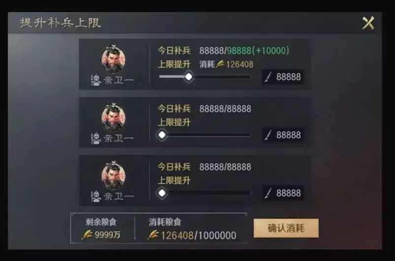 亲卫部队可上阵的武将数量,随“扩营”科技等级的提升而增加。部队间的武将可进行置换操作,但主城部队与亲卫部队之间禁止直接交换武将;置换操作会同步转移对应的兵力。处于城外作战状态的亲卫武将,其行为规则与主城部队一致:出征后不可重置或拆卸战法,亦不可卸下装备。亲卫部队支持随时间自动补兵,但存在补兵上限。当多支部队兵力相同时,补兵速度一致;若兵力不均,则优先补充兵力较低者。您可通过额外消耗粮食来提升单次补兵的上限。