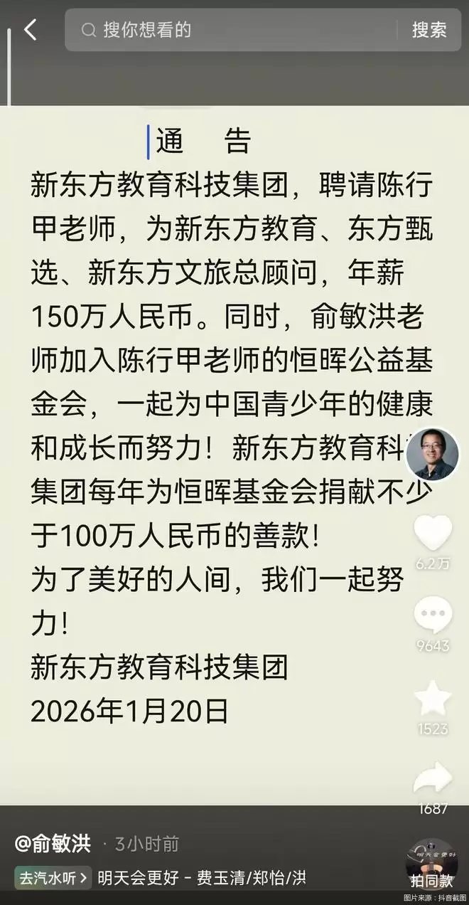 2月2日,俞敏洪在社媒平台上晒出与陈行甲合照,并配文:“陈行甲老师来新东方报到啦。” 1月20日,俞敏洪披露新东方教育科技集团的通告称,聘请陈行甲为新东方教育、东方甄选、新东方文旅总顾问,年薪1