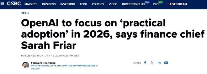 来源:环球网【环球网科技综合报道】1月20日消息,据CNBC、axios报道称,OpenAI首席财务官莎拉·弗莱尔(Sarah Friar)近日宣布,该公司将 2026 年定为“实际应用之年”,旨在