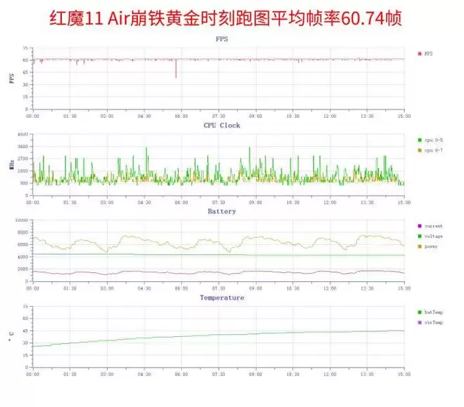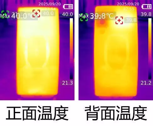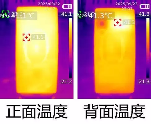 对手机而言,全程满帧运行并非难事,难点在于同时兼顾发热控制与功耗平衡。红魔11 Air连续游戏30分钟后,正面最高温度40℃,背面最高39.8℃。从热力图可见,背面风扇与风道区域存在明显低温区,高温区域主要集中在芯片部位,电池区域温度无明显升高。显然,主动式散热与被动式散热的组合方案,有效抑制了整机温度飙升。开启风扇并满负载运行时,游戏平均功耗仅为4.1W,虽略高于普通旗舰手机,但换来的是更极致的游戏体验。