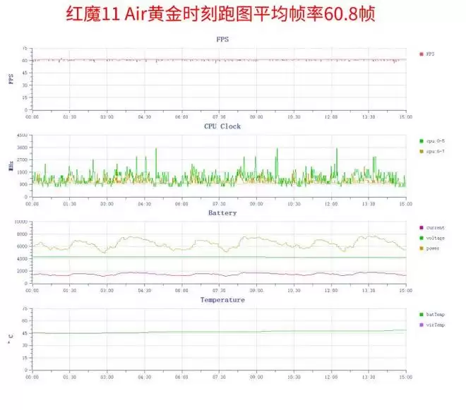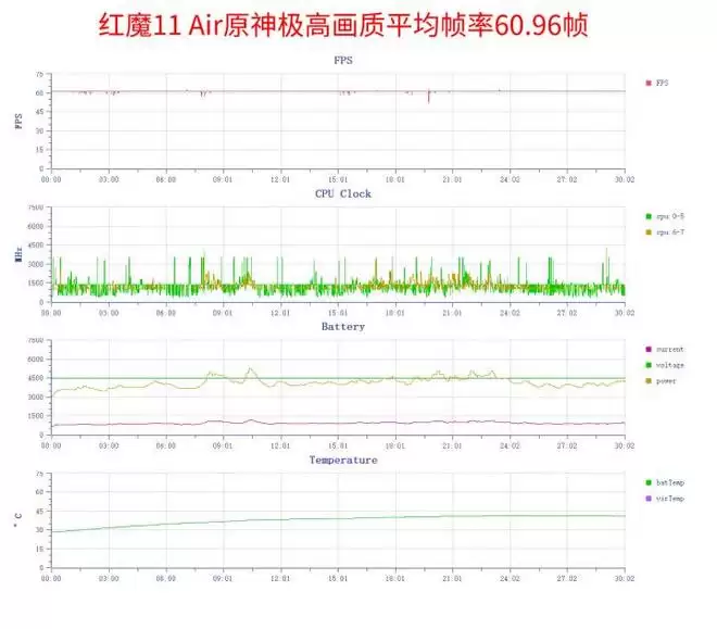 游戏实战测试中,我们将屏幕亮度锁定在250nit,全程开启风扇散热并切换至觉醒模式。在《原神》跑图+打怪测试场景中,红魔11 Air平均帧率达到60.96帧,运行极为平稳,即便在激烈打怪环节也无帧率波动,流畅性可给到夯。