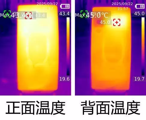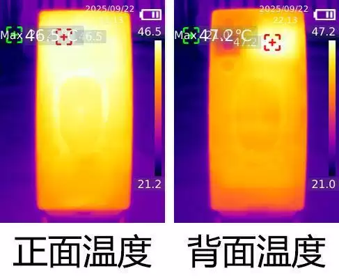 随后我们在相同场景下进行长时间稳定性测试,此次平均帧率60.8帧,平均功耗6.39W,稳定性与功耗表现几乎无变化。随着时间累积,机身温度略有上升,正面最高46.5℃,背面最高47.2℃,热力分布仍集中在芯片区域,机身始终无烫手感。