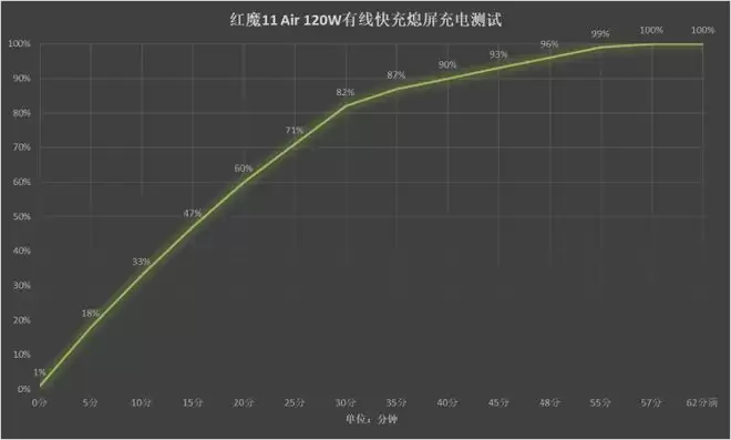 120W快充实测,15分钟可充电至47%,30分钟充到82%,而后充电速度开始放缓,57分钟充到100%,62分钟结束涓流完全充满。当然,充电分离功能依旧保留,因此长时间打游戏的话,是可以一直插电使用的。