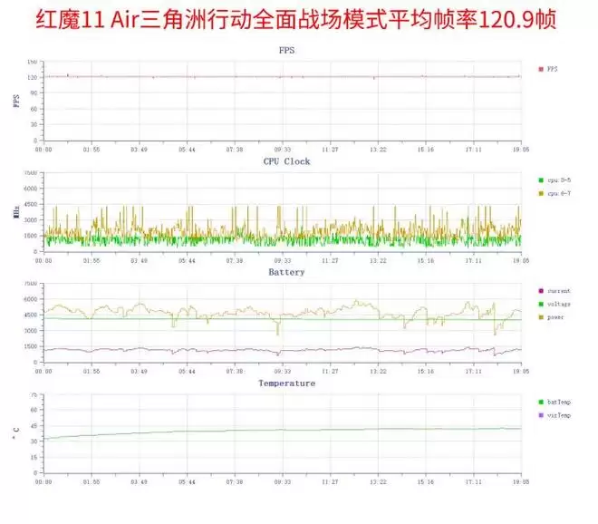 我们还测试了更高帧率要求的FPS游戏——《三角洲行动》全面战场模式,开启120帧+高清模式测试。一整局游戏中,除重新部署阶段系统帧率短暂降低外,红魔11 Air平均帧率达到120.9帧,稳定卡在帧率上限。正面最高温41.1℃,背面最高温41.3℃,平均功耗4.7W,在帧率、温度与功耗之间实现了出色均衡。