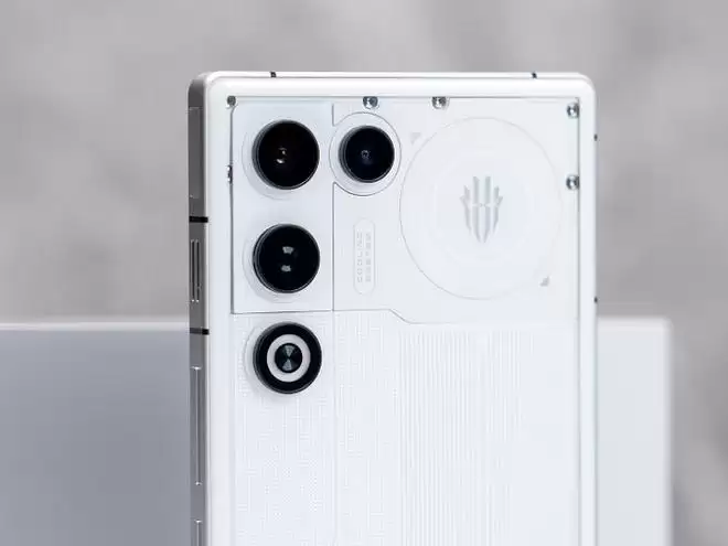 镜头区域方面,红魔11 Air继续采用垂直式镜头矩阵,共部署了四个“镜头”开孔,比前代多一处。实际上,该机仅配备两颗后置镜头,布局在上方第一排区域;星环RGB灯从顶部移至下方,中间则是主动式散热风扇,风扇与机身表面预留的缝隙即为进风口。