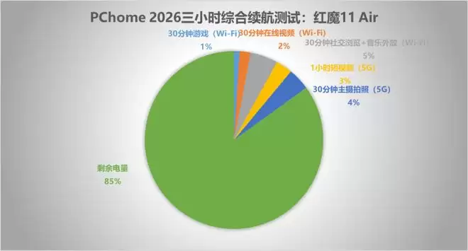 3小时续航实测剩余电量85%,比前代的63%直接多了22%,续航提升相当显著。可能有人会觉得,这个测试只能表明,红魔11 Air在高电量时的电池性能出色。对此,我们也在不同电量下,进行了游戏实战,1小时崩铁实测耗电量24%,1小时三角洲行动耗电20%,足以支撑数小时的高品质游戏体验。