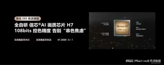 画质层面,E8S搭载海信全自研RGB真彩背光系统,覆盖100% BT.2020广色域,并实现ΔE<1的专业级色准。其核心驱动力来自全球首款基于RISC-V架构的信芯AI画质芯片H7,具备108bits的控光控色精度,完美解决高亮场景色彩冲淡与暗场细节失真的传统难题。