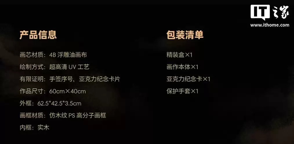 此外,每幅作品均配有独立的手写编号。画框采用仿木纹理的PS高分子外框与实木内框相结合的设计,质感出众。随产品还附赠一张亚克力材质纪念卡片。