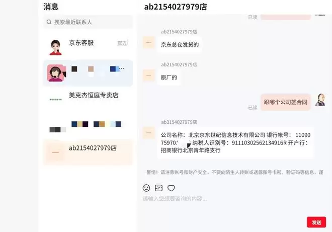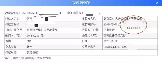 “我们也核实过这个信息,收款信息确实是京东最新的,因此没有起疑。”随后,赵先生提出分批付款、分批发货,于是将39500元货款打进了北京京东世纪信息技术有限公司的账户。
