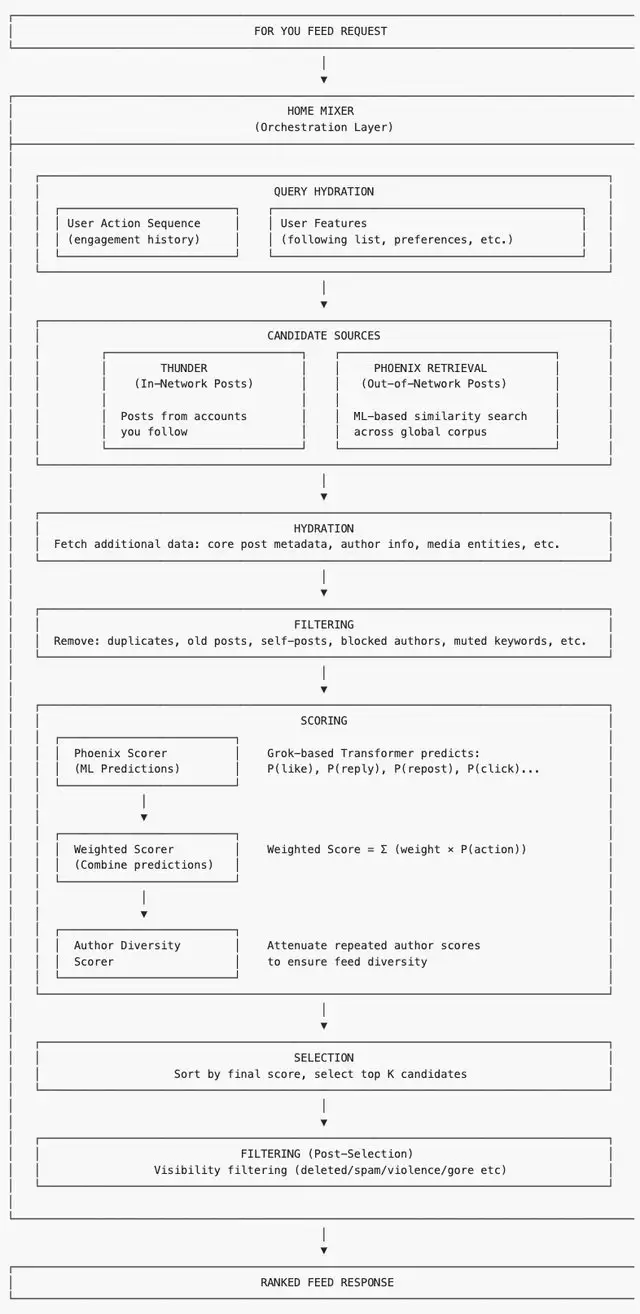 整个系统的核心是称为 Thunder 和 Phoenix 的组件。「For You」信息流算法会从两个来源中召回、排序并过滤内容: