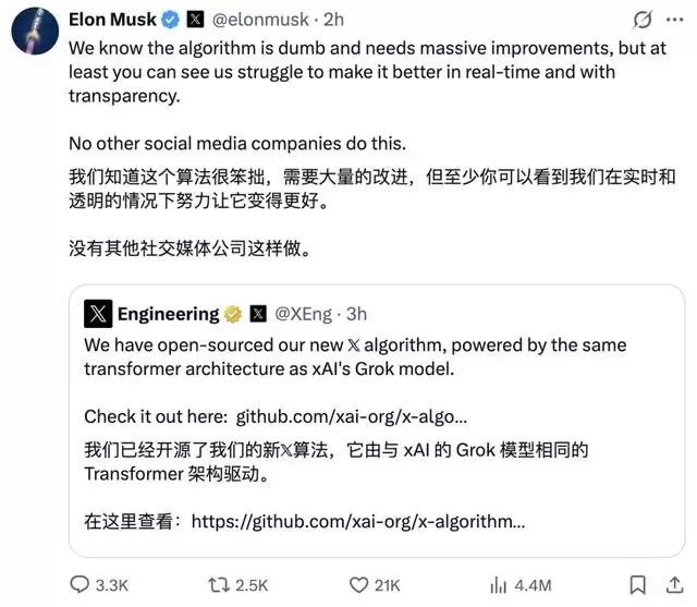 马斯克开源平台推荐算法,核心Transformer代码已公开