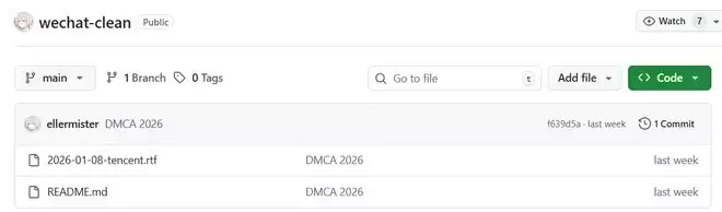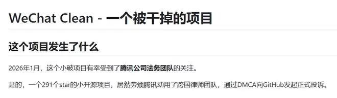 据项目作者ellermister所说,“WeChat Clean”原本是个帮助用户分析微信存储空间并清理的小工具。但由于在2026年1月,腾讯公司的法务团队动用了跨国律师团队,“通过DMCA向GitHub发起正式投诉”,因此他被迫删除了平台上的相关代码。