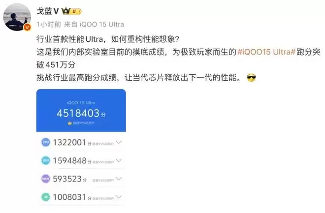 今天,iQOO 产品经理@戈蓝V 分享了 iQOO 15 Ultra 手机的内部实验室摸底跑分成绩 ,并表示“行业首款性能Ultra,如何重构性能想象?这是我们内部实验室目前的摸底成绩,为极致玩家而生的iQOO15 Ultra跑分突破451万分。挑战行业最高跑分成绩,让当代芯片释放出下一代的性能。”