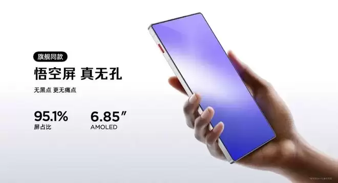 配备旗舰同款悟空屏·真无孔,6.85英寸,95.1%屏占比,1.25mm极窄边框,1.5K全面屏,屏下144Hz,多重护眼技术,瞬时触控采样率2500Hz,多指触控采样率960Hz,1600W屏下前置摄像头,屏下人像算法4.0。