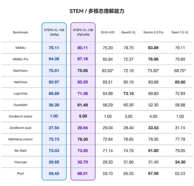 阶跃星辰公开的多模态基准测试结果显示,Step3-VL-10B是10B参数类别中最强大的开源模型。